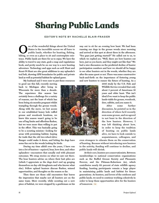 At their core, hunters are conservationists. Between memberships to national conservation organizations such as the Ruffed Grouse Society and Pheasants Forever, and the Pittman-Robertson Act, which contributes nearly 60 percent of state wildlife agency funding, hunting participants remain a large player in maintaining public lands and habitat for future generations. As hunters, and lovers of the outdoors and public lands, we need to continue working cohesively in order to keep these opportunities alive for the hunters of tomorrow.